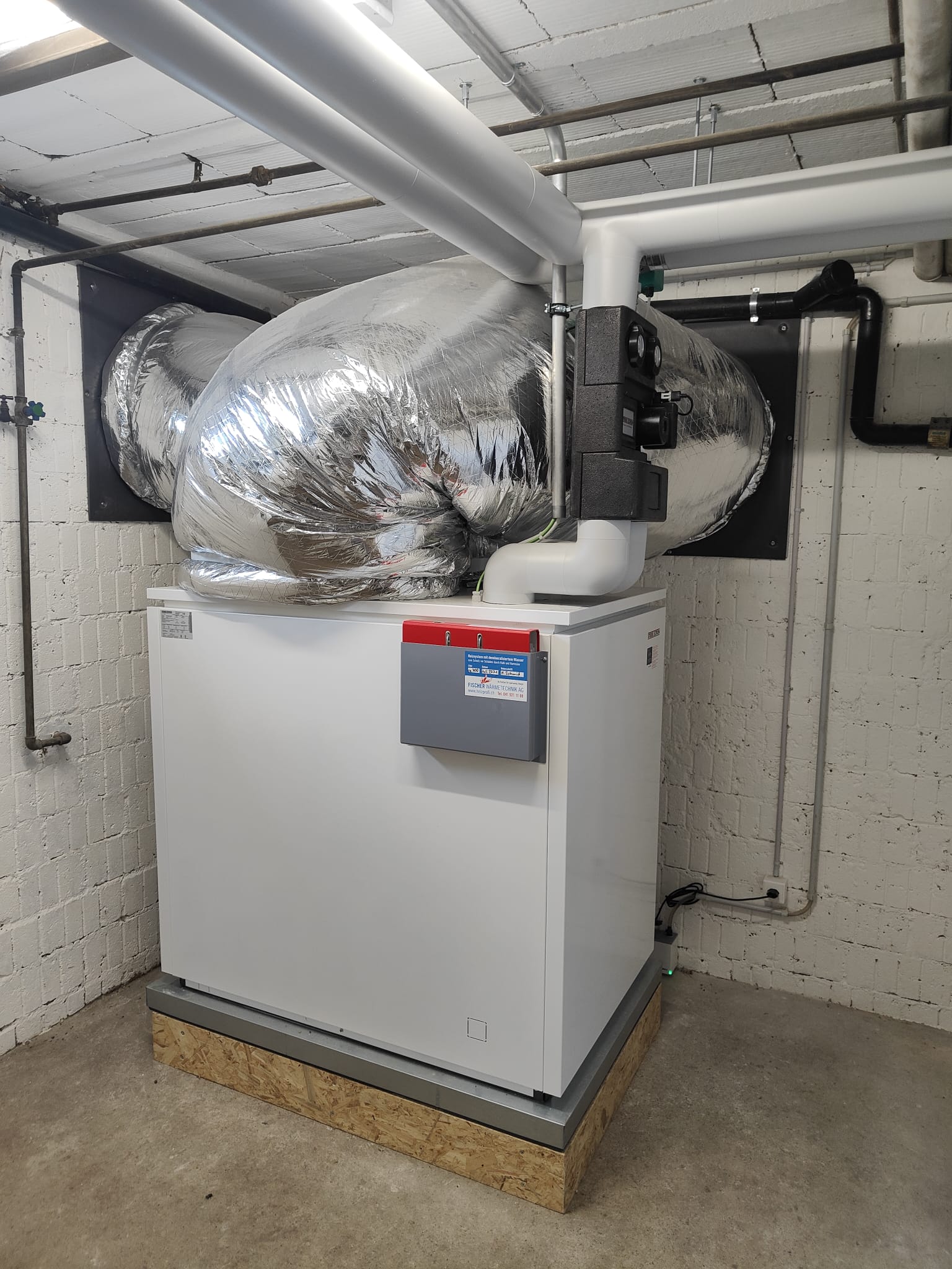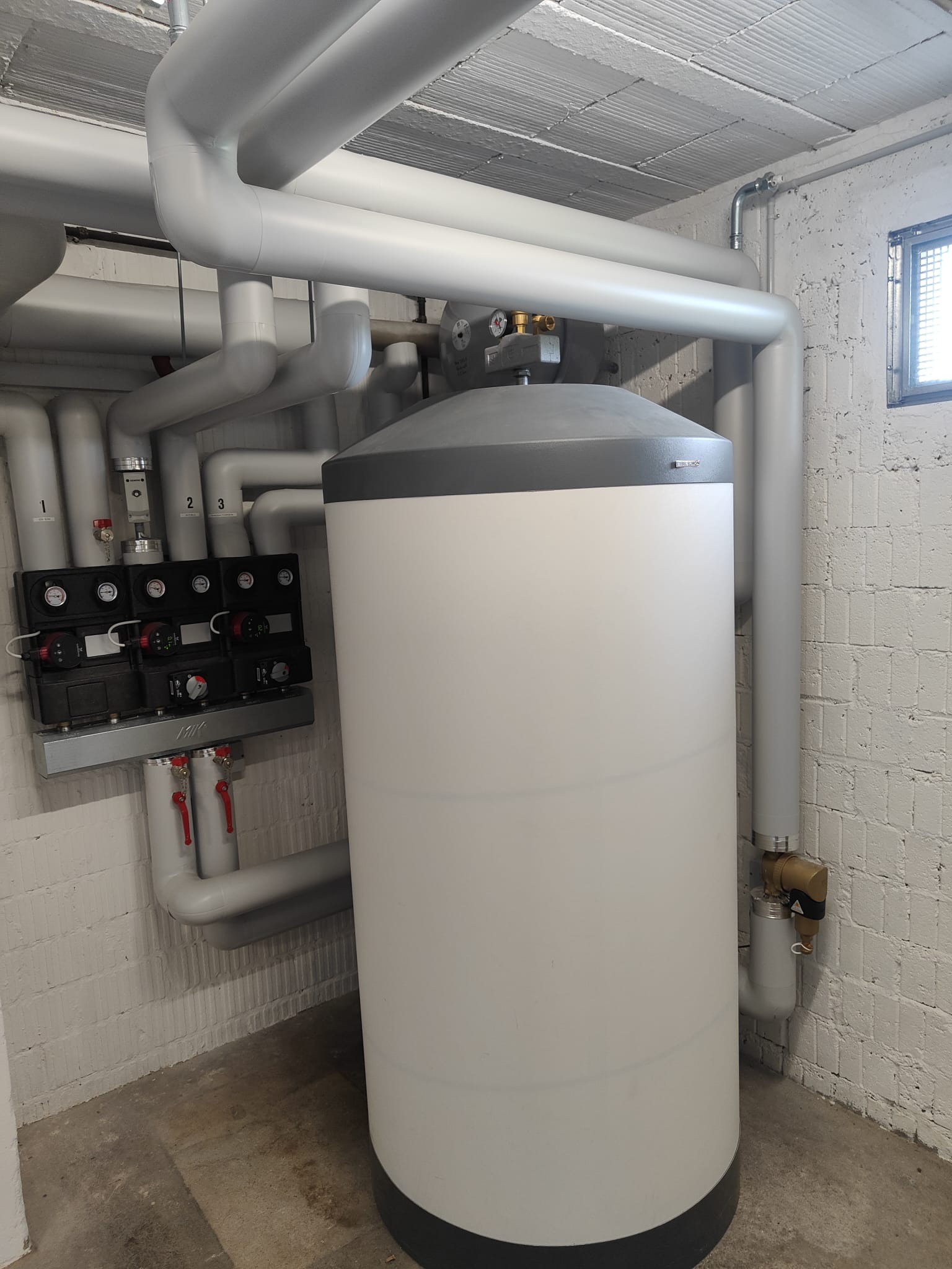In einem älteren Bauernhaus wurde die bestehende Stückholzheizung, die alten Holzspeicher sowie der Elektroboiler demontiert. Die Heizung besteht nun aus einer innenaufgestellten Wärmepumpe samt neuem Heizungsspeicher und Boiler. Der Boiler wird neu über die Wärmepumpe aufgeheizt.